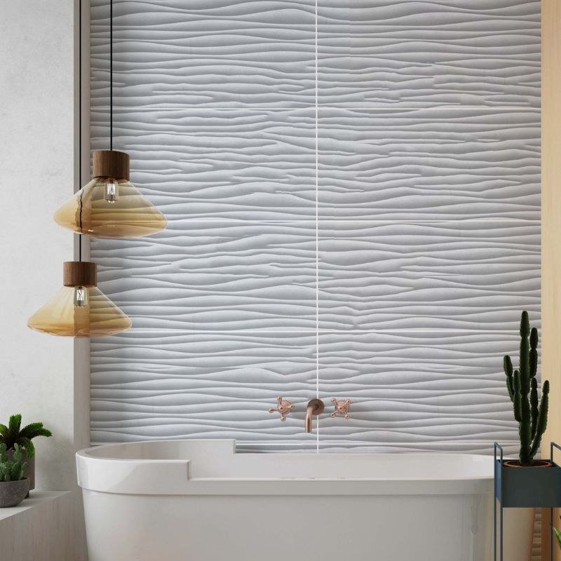 This light grey silver wave tile effect shower panel has a grey wave tile high definition print consisting of a grey wave matt rectangular tile. Complete with a dark grey and white grout line that gives an authentic tile look.