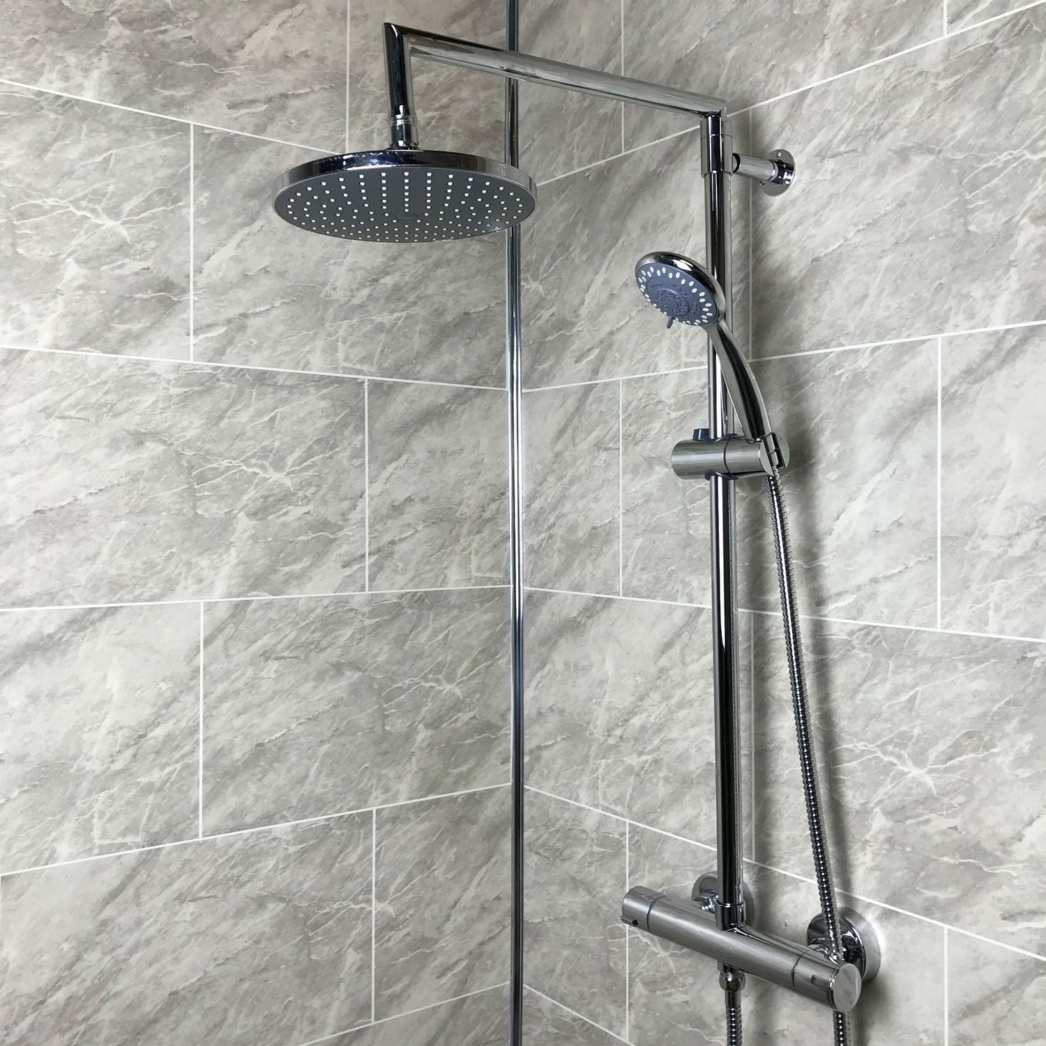 These grey marble wet wall boards are designed to be installed vertically or horizontally as a staggered tile/brick effect. Ideal for bathrooms, showers, kitchens and wet rooms but can also be used in any room of your home.