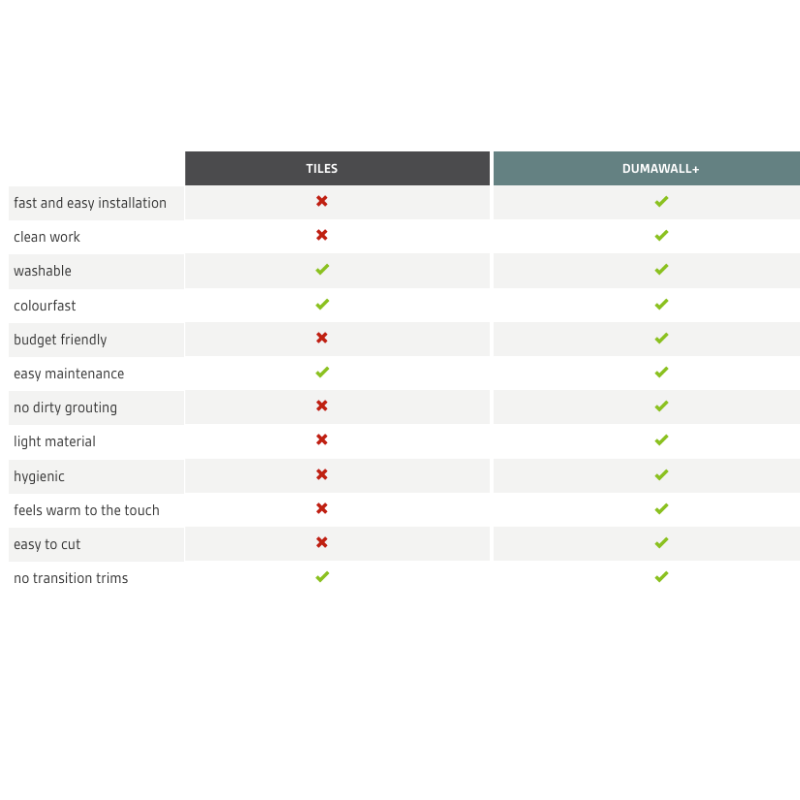 Dumawall Plus is a waterproof and watertight bathroom wall panel with a flush tongue and groove interlocking system. These bathroom wall panels are a solid core panel, and are UV-resistant. These wall panel tiles will bring an elegant finish to your indoor walls, with many style's within the Dumawall Plus Range to choose from. Care free fitting and aftercare. Once installed your bathroom walls will emit the natural attractiveness of a genuine tiled wall.