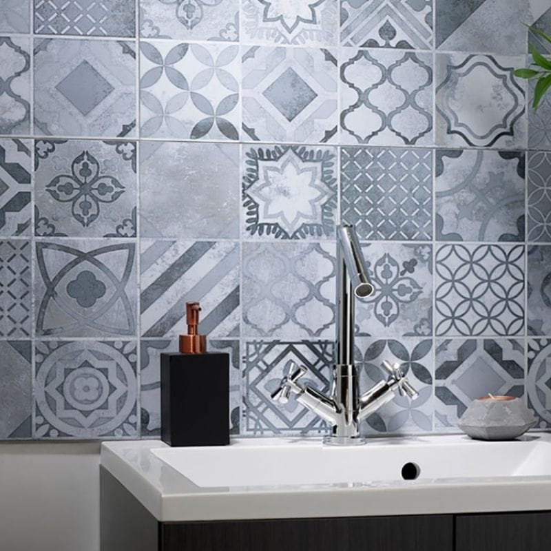 The Vinta Dumawall Plus bathroom wall tile panel is a light blue and grey Spanish tile effect bathroom wall panel, that will bring your bathroom style and a modern practical interior finish.