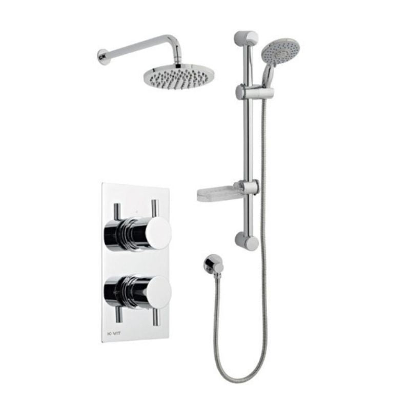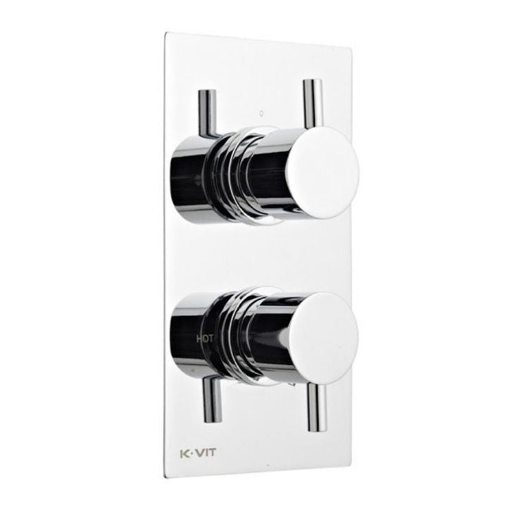 The Kartell Plan Concealed Thermostatic Shower Valve will add style and elegance to your overall bathroom appearance with its curved design and chrome finish. Dual levers that turn on the hot & cold water function to allow water flow to two shower heads / diverter function to power. This shower valve comes with a dual square handle design with a modern back panel rectangle design.