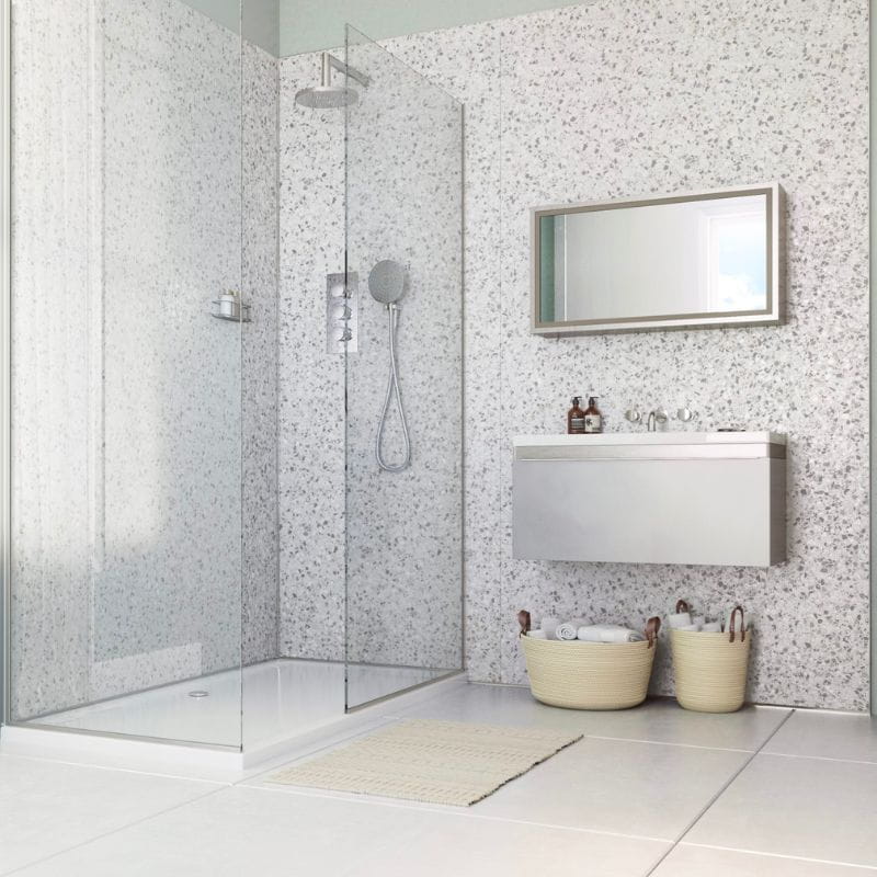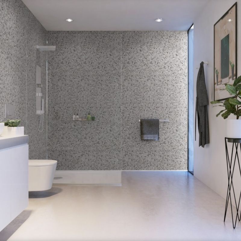 Positano Grey Terrazzo from the ShowerWall Mineral Collection. Get the look of genuine terrazzo stone with this distinctive design to create a fusion between modern and classic. The striking texture offers a strong statement, an elegant addition to any bathroom. Positano Grey Terrazzo's synchronised texture in particular brings you closer to an authentic look, for an impressive home interior.