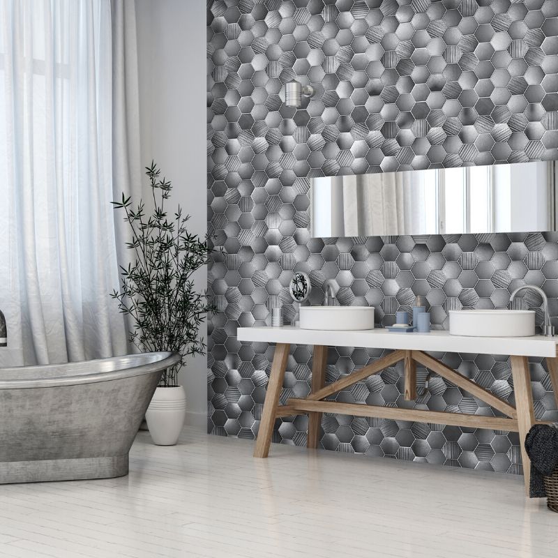 Modern geometric hexagonal pattern wall tile from premium collection, textured silver metallic tiles for stylish interior design and home decor.