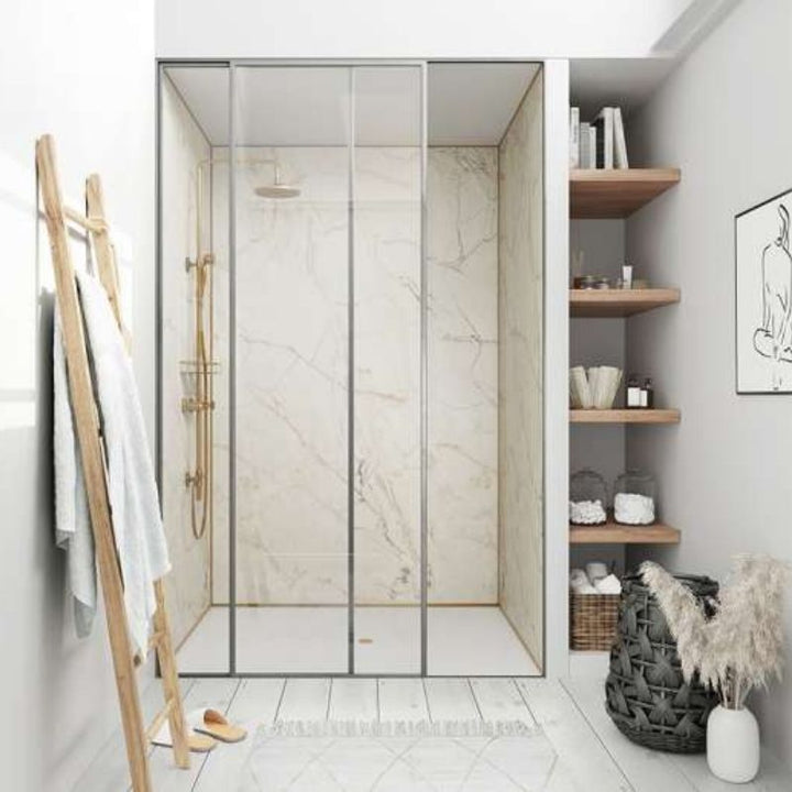 Shell Marble from the ShowerWall Marble Collection. Get the look of genuine marble with these distinctive designs to create a fusion between modern and classic. Striking white marbles with strong statement veins are an elegant addition to any bathroom. Shell Marble’s synchronised texture in particular brings you closer to an authentic marble, for an impressive feature wall.